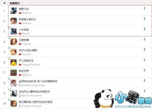 今日,据APP ANNIE数据显示,国内免费游戏下载榜前三易主,已被三款吃鸡手游霸占。第一名和第二名分别是《荒野行动》和《终结者2:审判日》,开发商均是网易游戏。而第三名则是《小米枪战》,属于小米旗下。而腾讯的《王者荣耀》最终也没能走进“决赛毒圈”,顺延到第四名,这也是《王者荣耀》罕见地被挤出免费下载榜前三的情况。