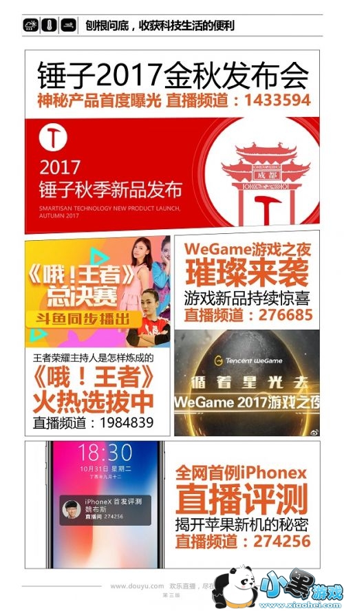 s7总决赛落幕,SKT终结了连胜,李哥飙泪当场,但传奇仍未落幕,让我们期待明年的表现。锤子金秋新品发布会上公布了新的坚果手机,以及……空气净化器?科技生活进步的快,跳跃的速度,也有点快哦。iphoneX刚发布,斗鱼便展开首例直播评测,关注苹果手机的朋友不容错过。