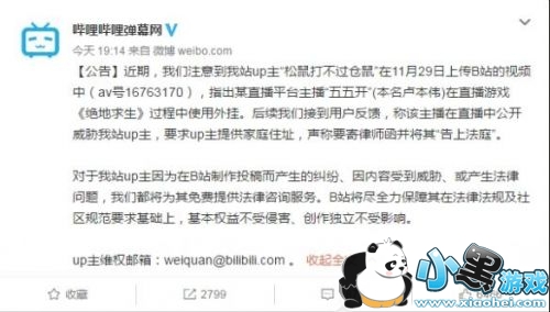 近日B站UP主“松鼠打不过仓鼠”投稿了一份视频,在视频中指出知名主播卢本伟在《绝地求生大逃杀(PlayerUnknown’s Battlegrounds)》中使用外挂。有网友反映,卢本伟在后续的直播中对这名主播发出了威胁性的言论。