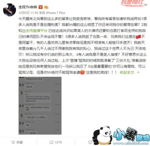 全民TV户外主播帝师也发表微博表明:“若某人还要继续和仓鼠打这场官司,全民TV和他私人的律师团队绝对不会坐视不管”。