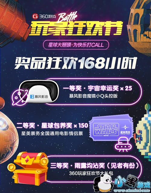 360游戏玩家狂欢节,是360游戏平台每年一度的年终游戏盛典。狂欢节覆盖手游、端游、页游全品类近百款游戏,以高额奖励、丰富玩法为核心,回馈玩家为宗旨,用贴心的游戏服务和互动体验,让玩家可以尽情享受游戏带来的乐趣。2017年第三届360游戏玩家狂欢节,以“星球大Battle,为快乐打Call!”为主题,开启了一场席卷游戏圈的“星球大战”。