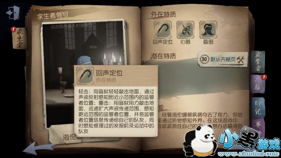 轻击:用盲杖轻轻敲击地面。通过声波反射感知附近小范围内的监管者位置;重击:用盲杖用力敲击地面,迅速扩大声波传递范围。全图感知监管者位置,并将监管者位置信息传递给队友,同时感知修理过的发报机及运动中的队友。