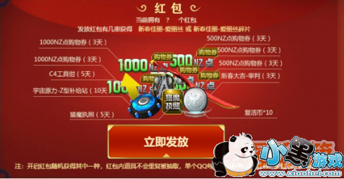 玩家可消耗积分兑换对应礼包,发放红包有几率获得新春佳丽-爱丽丝(永久)或新春佳丽-爱丽丝碎片。红包可分享至QQ好友和QQ群,每个红包可领取10次,本人也可领取,单Q单个红包只能领取1次。
