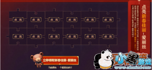 消耗新春佳丽-爱丽丝碎片*1即可点亮一个爱丽丝拼图,拼图全部被点亮后,可领取新春佳丽-爱丽丝(永久)。可通过红包获得新春佳丽-爱丽丝碎片。