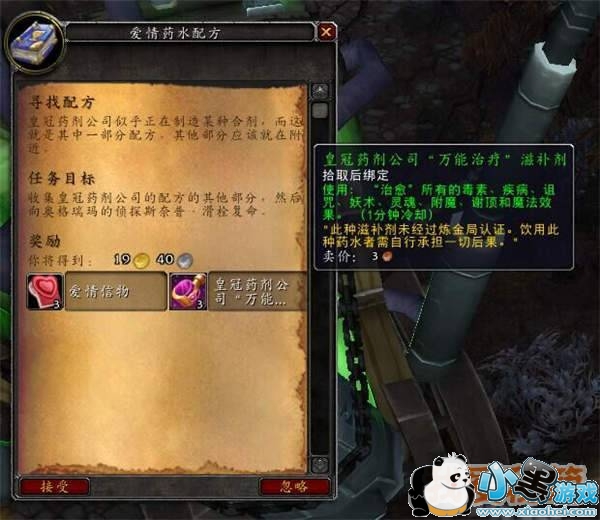 在日常任务地点可接到:[寻找配方]:奖励:[爱情信物]x3,[皇冠药剂公司“万能治疗”滋补剂]x3 <收集附近散落的三张配方>