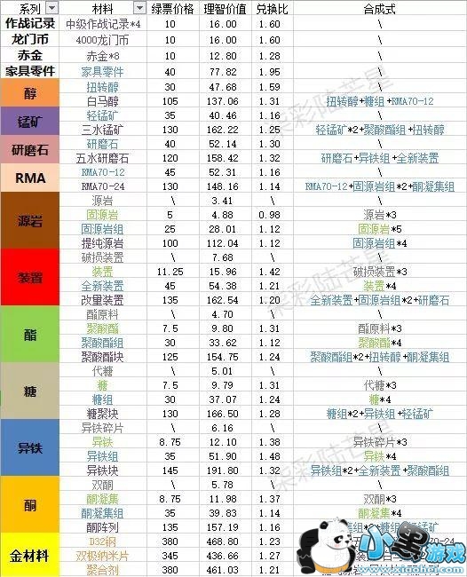 首先是由 柒彩陆芒星 大佬制作的材料价值与绿票兑换性价比总览,也是后面数据的基础。(此表不计算活动)