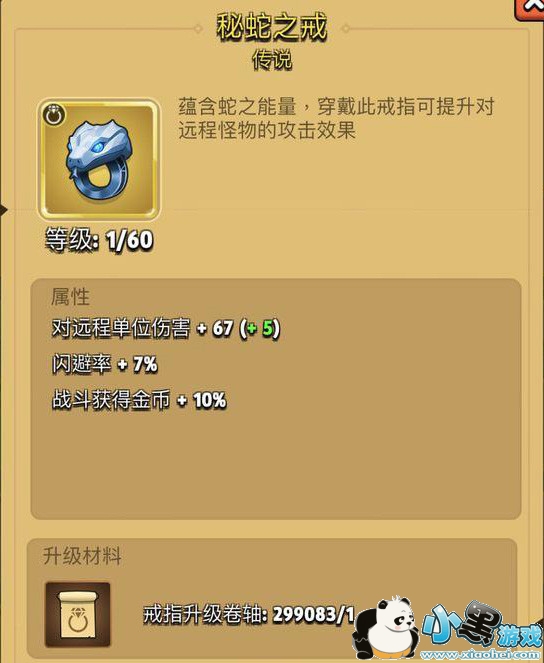 弓箭传说中有不少的武器装备,每一个武器装备都有不一样的属性,秘蛇之戒对于喜欢远程的玩家都很大的帮助,下面小黑游戏就给玩家带来弓箭传说秘蛇之戒怎么样的内容,一起去看看吧!