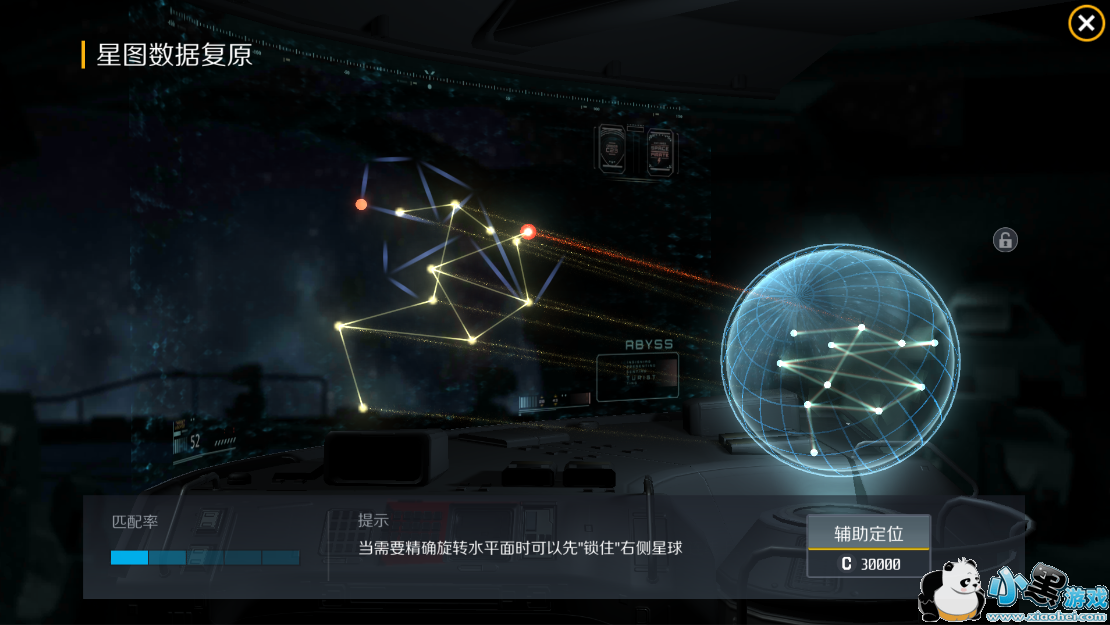 在复原时,玩家需要转动屏幕右侧的全息球体,使球体内部结构在远处荧幕上的投影与荧幕本身所显示的图案重合。因为品质等级越高的星图加密数据进行人工复原的难度越大,所以系统还同时提供了辅助定位的功能。