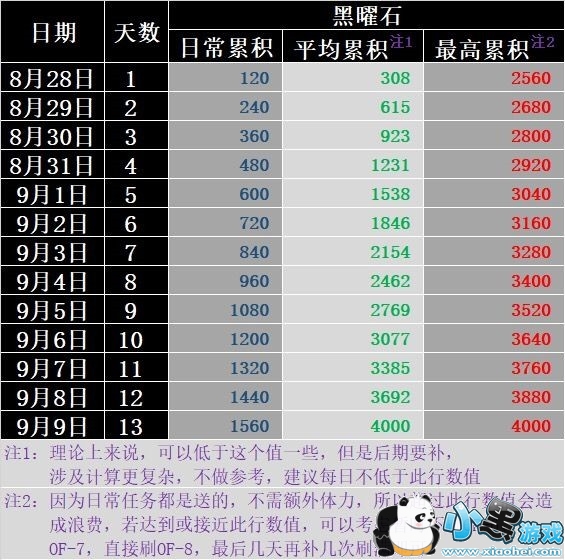 在我的舟游小分队里大家对于黑曜石要怎么刷,每天刷多少都比较迷茫,我就在网上找了找别人分享的攻略,发现大家都是计算各种数据,看完之后还是会每天都产生疑问“我今天应该刷多少黑曜石和门票?”为了方便大家我就做了一个简单的表格,告诉大家每天要刷多少。这里主要针对月卡和微氪玩家,对于钞能力玩家参考意义不大,看黑曜石部分即可。