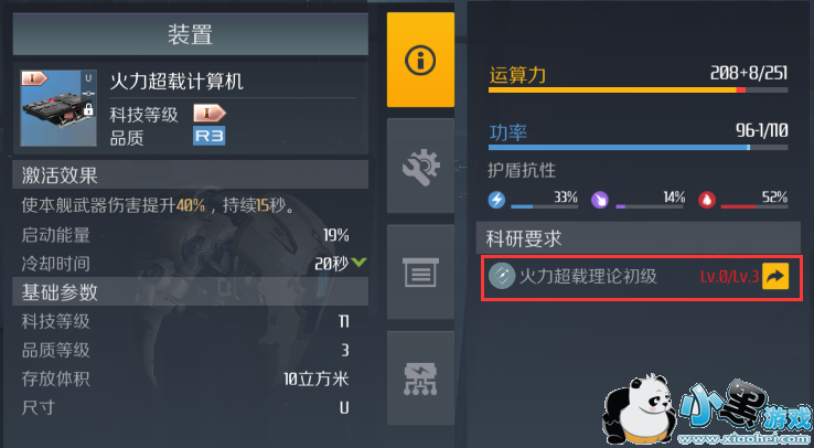 反过来,在装备的详情介绍里能够找到安装这个装备所需消耗的装配资源,安装装备所需的功率和运算力也会受到来自装备尺寸和科技等级的影响:尺寸越大的装备所需消耗的装配资源越高,而科技等级越高的装备所需消耗的装配资源也越多:
