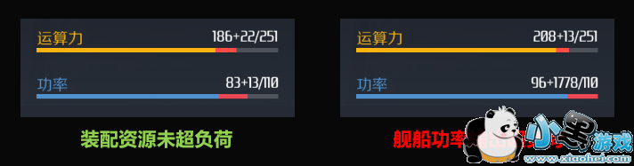 在停机坪安装或替换装备时,界面会直接显示舰船所提供的装配资源是否超负荷,装备必须在同时满足不过度使用功率和运算力需求的情况下才能被成功安装: