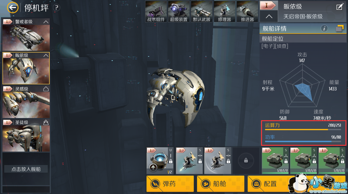 在停机坪部署一艘舰船后,就能立刻在界面上看到这艘船所能提供的功率和运算力: