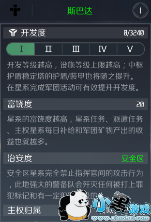 星系星图界面顶部的标签展示的是所选恒星系的星系名、主权归属和星系的开发等级,若要获取进一步的详细信息,还可以点击这个标签以展开详情面板: