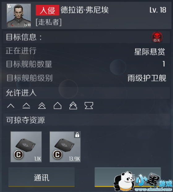 入侵列表显示的是被成功定位的扫描目标,点击分类中所展示的任意条目,即可查看目标的名字、所属、等级、正在进行的活动、正驾驶的舰船等详细信息: