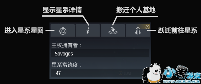 在星域星图中选中任意代表恒星系的点时会弹出针对该恒星系的功能面板,在面板中会显示星系的基本信息,并提供4个功能按钮以供进一步的操作: