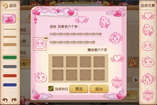 在新增的礼物系统中,玩家不仅可以直接通过花费仙玉将商城道具赠送给游戏好友,还可以自己动手设计独一无二的礼包和卡纸作为道具装饰,让礼物看起来更加美观动人。在包装的过程中,玩家可以自己选择礼包的颜色和花纹,或选择自己所喜的颜色,或挑中赠送对象所爱的花纹,满满心意尽皆于细微中得到体现;而在设计卡纸的过程中,除了可以选择卡纸的边框花纹外,玩家还能随心增添超级泡泡、超级神鸡、超级神猴等可爱形象于其上,并附上几句想要对赠送对象表达的话,让收礼者感受到你的浓浓情谊。