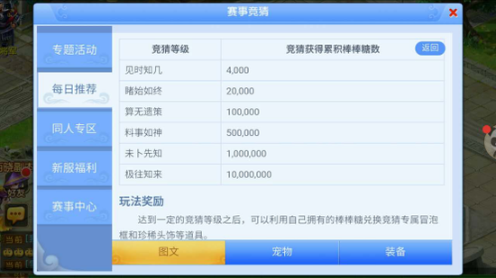 看点增多,变数频出也使得本届全民PK争霸赛悬念性更强,为了增强赛事的娱乐性,让玩家在观战之余,亲身感受到全民狂欢的乐趣,《梦幻西游》手游将于8月16日开启全民PK争霸赛总决赛竞猜玩法,届时,感兴趣的玩家都可以倾情参与其中。需要注意的是,参与竞猜需要玩家等级≥40级,通过竞猜将有机会赢取大量的棒棒糖奖励,而根据竞猜累积获得的棒棒糖数,还会具体划分为6个竞猜等级,分别为:见时知几(4,000)、睹始如终(20,000)、算无遗策(100,000)、料事如神(500,000)、未卜先知(1,000,000)、极往知来(10,000,000)。