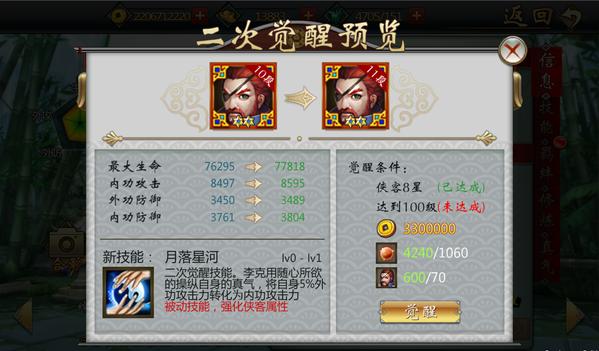 月落星河:二次觉醒技能。李克用将自身5%(+1%/每级,最大15%)外功攻击力转化为内功攻击力
