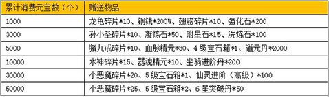 活动内容:活动期间,将士们累积消耗达到一定数量的元宝,即可在游戏内“活动”面板中领取超强豪华军备福利,包括小恶魔、水神、猪九戒、孙小圣、龙龟海量仙宠,5级宝石箱、血脉精元、凝炼石、6星突破丹等海量超值福禄返赠,限时参加,震撼升级错过就太可惜啦~