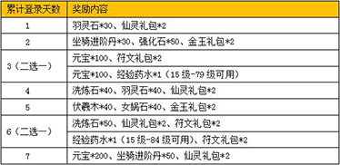 活动内容:活动期间,只需累计登录相应天数,即可领取海量豪华登录奖励。包括海量元宝福利、经验药水、仙灵礼包、坐骑进阶丹、强化石、符文礼包、羽灵石、伏羲木、女娲石、洗炼石等海量礼品,应有尽有,赶快通知小伙伴!错过就太可惜了!记住在活动面板领取对应奖励哦!