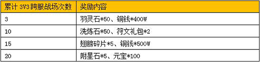 活动内容:活动期间,将士们累计参加3V3跨服战场达到指定次数,即可在活动面板获得海量优惠福利。给力元宝俸禄、翅膀碎片、洗炼石、羽灵石等酷炫奖励。战鼓已擂响,号角已吹起,将士们赶快出击展现自己的傲世之才吧!