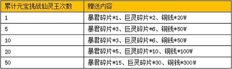 1、 活动期间,累计元宝挑战仙灵王达到指定次数,即可获得本次活动对应档次奖励。免费挑战次数不计入本次活动挑战次数之中。