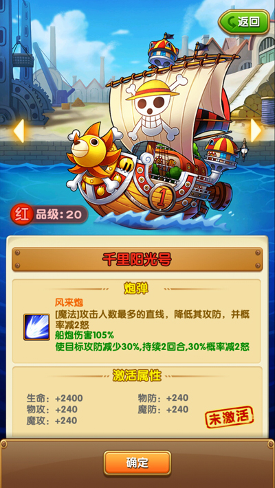 几艘船中唯入选的新一代海贼的座驾,必须是我们的主角草帽团的阳光号。风来炮的直线攻击以控制为主,看似有些温和。但在实际的使用中已经证明了它的强大效果。