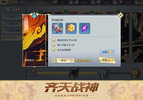 当然对于副本玩家最关心的还是奖励内容了,《齐天战神》的主线副本奖励主要分为副本内掉落、通关奖励和成就宝箱三种。玩家在副本内不管是击杀小怪、开宝箱还是击败BOSS都能获得各种道具奖励,通关后还能开启宝箱获得随机品质的各式装备哦!除此之外,玩家在章节中累计获得足够评价星数,还能获得成就宝箱奖励。