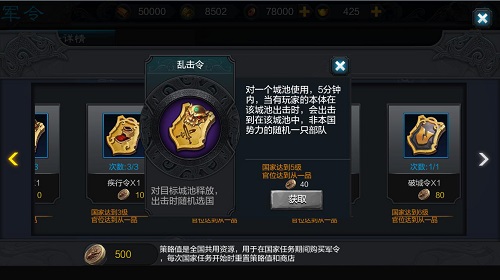 该军令购买上限为单次国战1个,持续时间5分钟,指定城池使用;