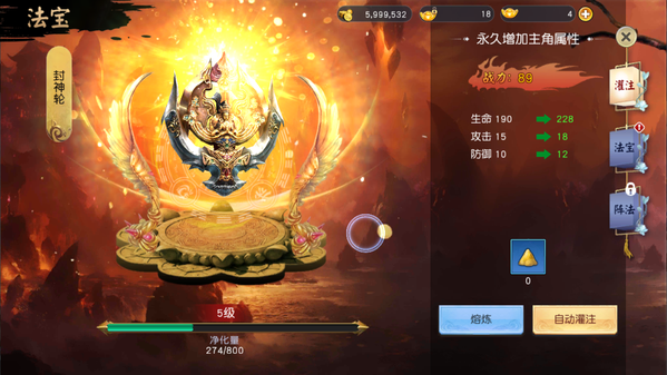 法宝系统共有12阶,每一阶法宝都有相应的外观,结魄灯,玄玉昆仑扇,东皇钟……再续三世情结,更有灌注和阵法系统,多余装备堆积成山,快来分解灌注吧。阵法可通过星耀石永久提高人物属性值,可在秘境或BOSS系统中获得哦,升级法宝需要消耗法宝升阶丹,阶数越高消耗的升阶丹也越多。即可永久提升角色属性,可在材料秘境、宗门、阵营活动、限时活动、商城等多重渠道渠道中获得。