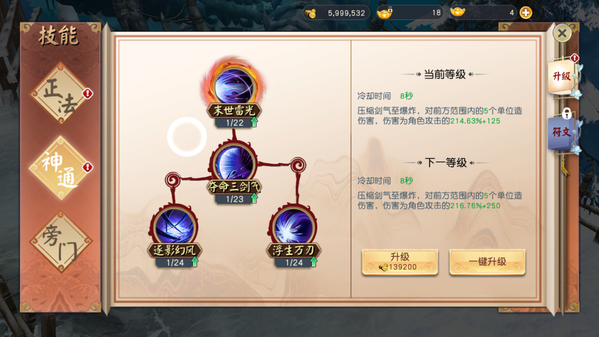 游戏中的技能分为正法(普通攻击)及神通(职业技能)、旁门(位移技能)3大类,升级技能需要消耗铜币,只有满足该技能所需消耗的铜币才可以升级,不同技能所需消耗的铜币也不同,技能越高消耗的铜币也越多。还可通过符文材料激活符文技能,符文材料可在boss挑战中获得。