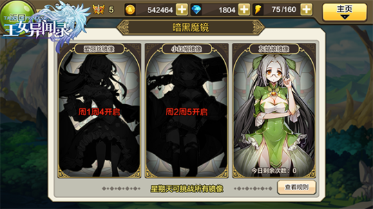 黑暗魔镜的入口,在勇士开始冒险,进入地图之后的下方。点击进入之后可以发现,每位王女的黑暗魔镜开放时间是不一样的,需要积累对应材料的玩家一定要记好时间~不过星期天会开放全部的黑暗魔镜,不用因为错过时间而感到沮丧哟~