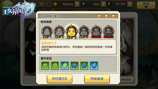 每个镜像都分为六个难度等级,按照骑士团等级解锁难度,难度越高,奖励越丰厚。每个难度都有非常丰厚的首次通关奖励。当三星通关之后就可以开启快速的扫荡模式啦~如果暂时无法通过更高等级的难度,可以先扫荡前一个难度等级的镜像,强化符石后再来挑战。
