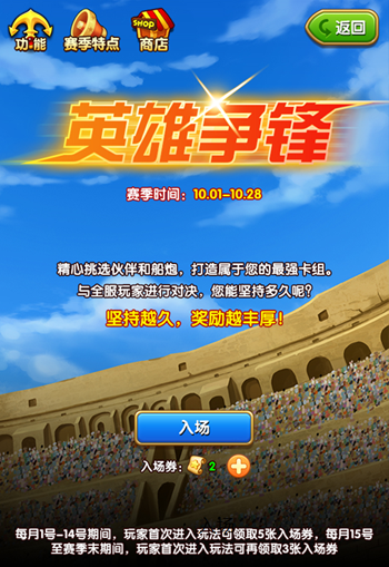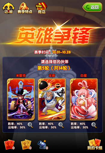 “英雄争锋”是一个跨服“PVP”玩法,各位船长通过选取随机提供的伙伴组建自己的卡组与其他船长展开战斗,每一套卡组达成三负或十胜即宣告本轮结束。胜场的积累能够帮助你在本赛季中提高排名以及更多奖励,每个赛季持续一个月。只有运气与实力并重的船长才能名列排行榜。