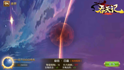 9377《吞天记》之中的“境界”修炼系统玩法,会在道友们等级达到十多级的时候即可开启。而在随后的冒险探索历程当中,道友们便可以一直进行自身主角角色境界的修炼提升。境界的修炼,不但能够让道友们的角色获得大量的属性加成,还可以实现品质的突破进阶!