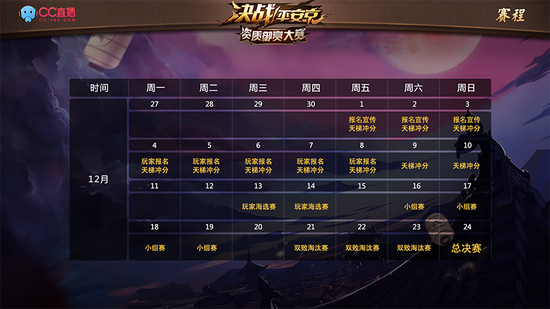 12月13日到14日,晋级的64支优秀战队将按照排位顺序进行B01单败淘汰赛,决出八支晋级小组赛的战队。而在12月16日到19日期间,他们将与职业队、主播队展开激烈厮杀,分四组进行BO2小组单循环积分赛,每组积分的前两名晋级最终的八强赛。