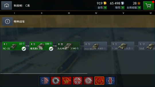 受限于军工科技和经济实力,C系低级坦克均来自于其他系,如1级轻坦NC-31为F系1级轻坦雷诺FT的外销版,2级轻坦维克斯E B型有着浓重的Y系色彩,3级中坦97中战为R系引进……可以说,通过C系低级坦克,玩家将对各系坦克都有初步了解,对于今后明确坦克系别和战斗都有着积极作用。