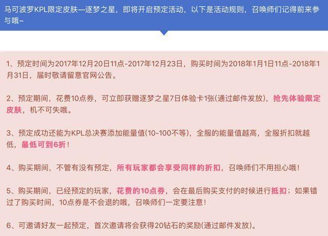 预定需要花费10点券,这10点券有以下作用:可以获得逐梦之星7天体验卡1张,可以抢先体验这款皮肤,并且可以为KPL总决赛添加能量值(10-100不等),全服能量值越高,折扣也就越低,最低可到6折折扣!