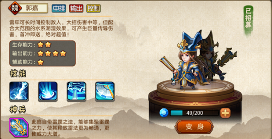 再谈郭嘉,6元神将,良心作品,有最长雷系的雷牢,锁住敌人,画地为牢,同时能跟甄姬连成水雷,把boss轰傻!