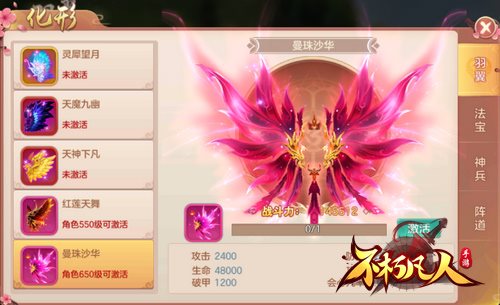 4399《不朽凡人》让每位玩家都实现超凡入圣的梦想,造化系统共包括羽翼、法宝、神兵、阵道四大养成体系,不管是解锁被动技能的羽翼,还是挂机升级更快的阵道,每一次的提升不仅能强化属性效果,更能激活多种华丽化形,让你行走仙界时回头率暴涨!