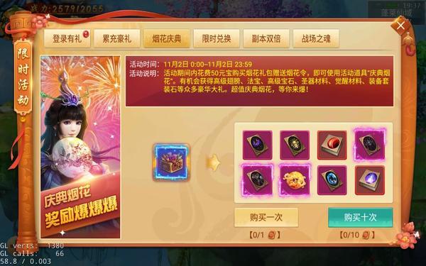 活动说明:活动期间内花费50元宝购买并使用活动道具“庆典烟花”,即有机会获得高级翅膀、法宝、高级宝石、装备套装石等众多豪华大礼。超值庆典烟花,等你来爆!