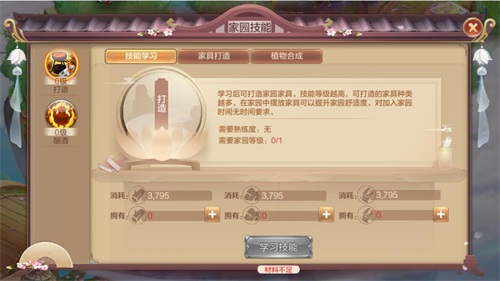 玩家拥有家园后,就可以进行家园技能的学习。家园技能分为打造和酿酒,其中“打造”技能可以让玩家建设属于自己的家具,“酿酒”则会让玩家拥有各种增益BUFF。