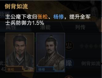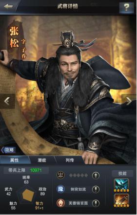 首先从张松的五维属性上看,政治和智力是比较突出的两个属性,分别达到了89和91的数值。在武将突破后,智力值还会获得1点增加,属于典型的智力将。武将缘分方面,和蓝将杨修组成“倒背如流”的缘分组合,可以提升全军士兵防御力1.5%。鉴于杨修作为蓝将比较容易获取,这个缘分加成的激活也就没有太大难度,可以说是性价比较高了。
