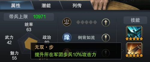 张松的两个技能对应了其步兵将的定位。第一个技能“奋起·步”,能提升所在部队步兵20%的攻击力。攻击提升率较大,但只是对于部队的加成了。第二个技能“无双·步”能提升所在军团步兵10%的攻击力。提升率和张飞一致,是一个比较强力的技能。既有部队技能也有军团技能,张松算是一个非常实用的步兵橙将了。