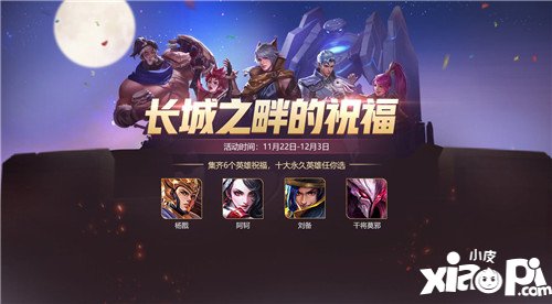 累计必得永久英雄:集齐6个英雄(花木兰、铠、百里守约、百里玄策、苏烈、盾山)的祝福,以下英雄任选一个领取:干将莫邪、刘备、张良、梦奇、蔡文姬、阿轲、杨戬、娜可露露、不知火舞、橘右京。