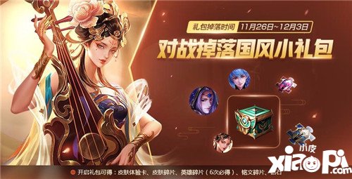 国风小礼包—打开后可获得以下奖励之一:弈星-踏雪寻梅(3日)、杨玉环-霓裳曲(3日)、明世隐-占星师(3日)、英雄碎片*1、皮肤碎片*1、铭文碎片*5、钻石*5。累计6次必得英雄碎片*1.
