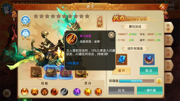 正如十阶坐骑“苍冥御龙”,自带技能“腾云驾雾”,效果是有一定几率闪避任何攻击——即进入无敌状态!10%几率虽然不高,而一旦触发,3秒钟足以让你完成一场惊心动魄的翻盘。可以说,坐骑能不能达到10阶,预计将会是PK实力的一大分水岭!
