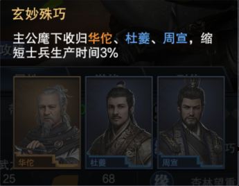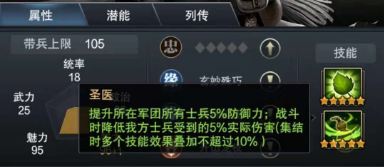 华佗的一大亮点就在于其技能均是面向军团所有士兵的增益。第一个技能“济世”,能提升所在军团所有士兵5%攻击力,并降低5%死亡率。第二个技能“圣医”,能提升所在军团所有士兵5%防御力,并在战斗时降低本方士兵受到的5%实际伤害。虽然说加成系数只有5%,但增益维度较多,可以说华佗是现版本下强力的百搭军团橙将,对于各位主公来说实用性很强。