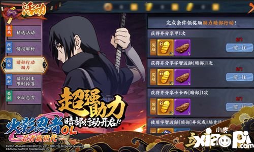 在全新开放的暗部系列主题活动中,玩家可通关暗部副本,重温暗部篇剧情内容。在副本中将会掉落碎片与奖赏卷,碎片用以进行情报解析,成功解析的情报将可获得暗部的信赖度,当信赖度达到60时,可开启暗部奖赏。除了暗部副本外,游戏也为玩家开启更高难度的——暗袭任务,玩家组队挑战副本,除了获得忍具锻造石、随机忍具外,更有几率获得奖赏卷。奖赏卷可在暗部奖赏活动中兑换暗部时装及稀有忍者碎片等奖励。