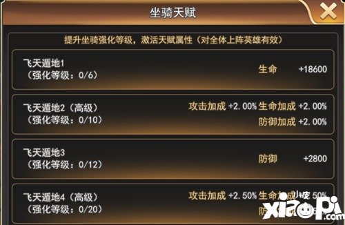 圣兽·天之主的坐骑天赋名称叫做【飞天遁地】,每提升一定等级就可以增加一定生命力、攻击力和防御力的数值加成以及百分比加成。